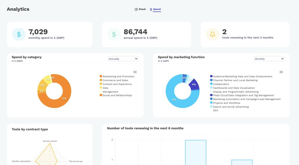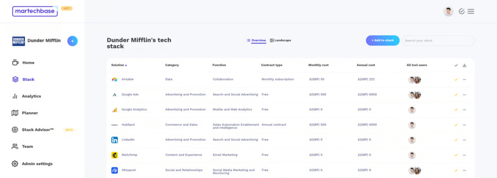 Martechbase makes marketing technology management easy for small and medium businesses. Swap the spreadsheets for a clear view of your apps, owners, and spending to spot gaps and find growth opportunities.